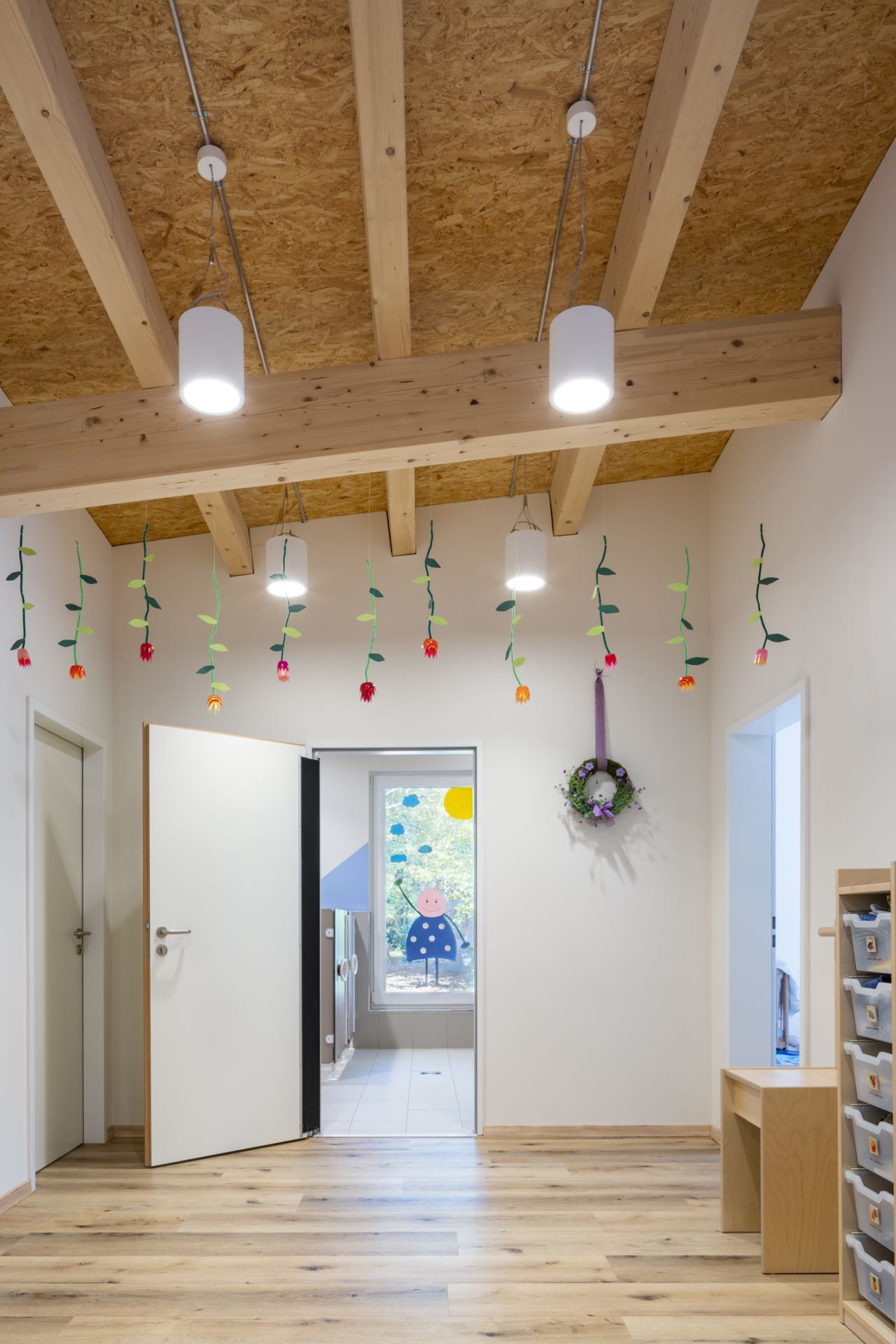 Erweiterungsneubau für eine Kindertagesstätte, 0-3 Jahre, in Holzrahmenbauweise mit Holzverkleidung am Bussardweg, Wermelskirchen.